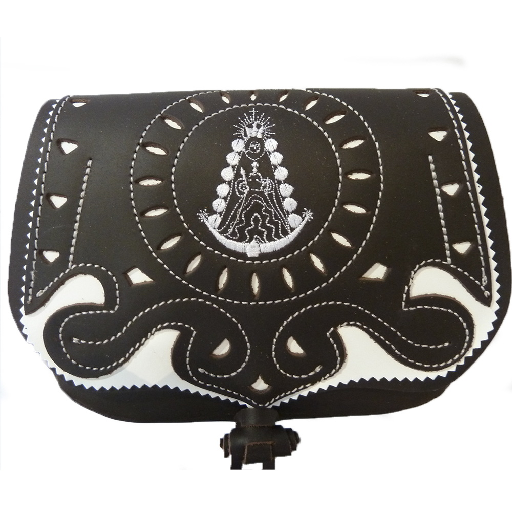 Bolso rociero convertible en riñonera de piel engrasada con picado en fondo blanco con bordado Virgen del Rocío, con cierre de bellota, asas ajustables, trabilla en la parte trasera, permitiendo quitarle el asa y colocarlo en el cinturón para mayor comodidad.