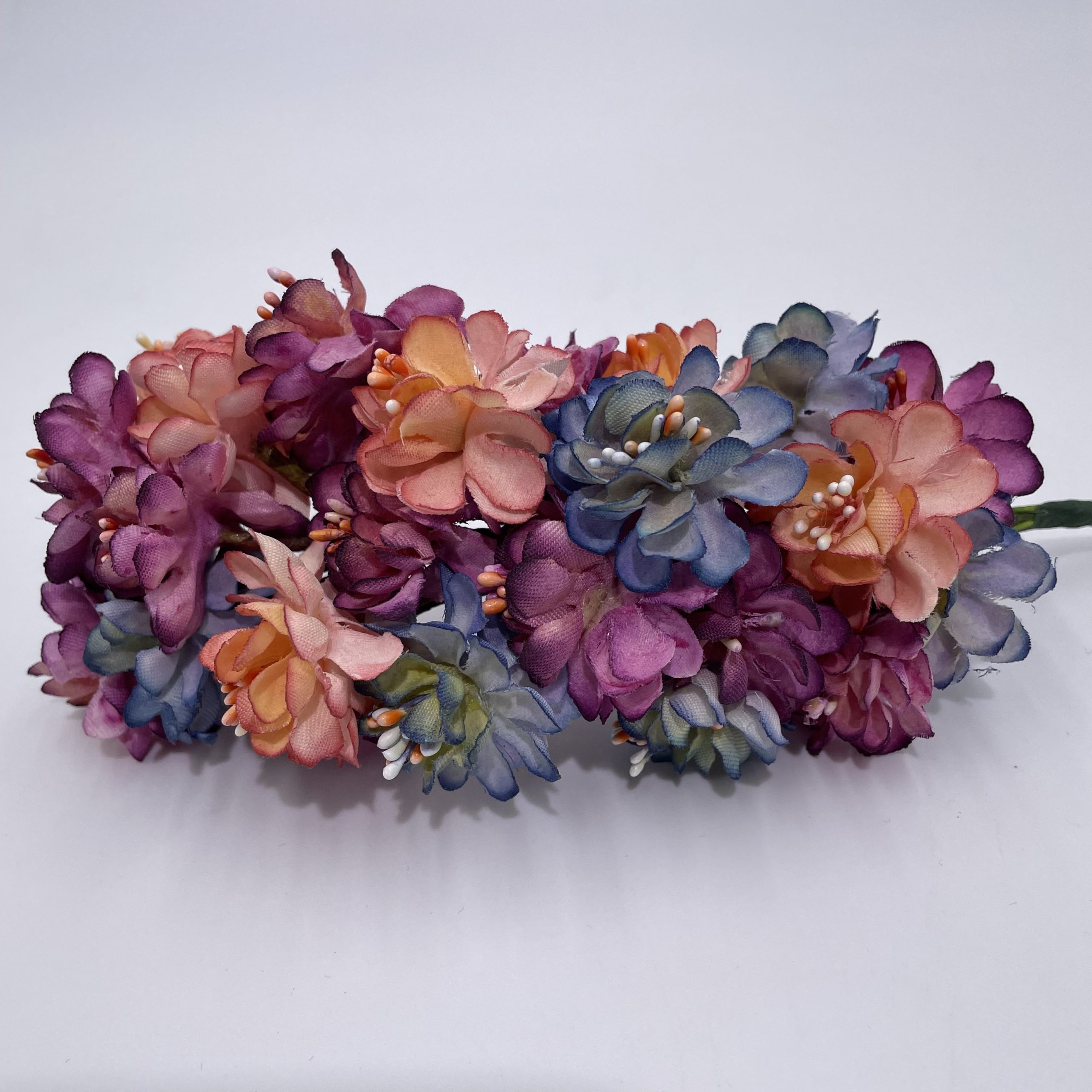 Ramillete de flores en forma de corona, teñidas y empolvadas.