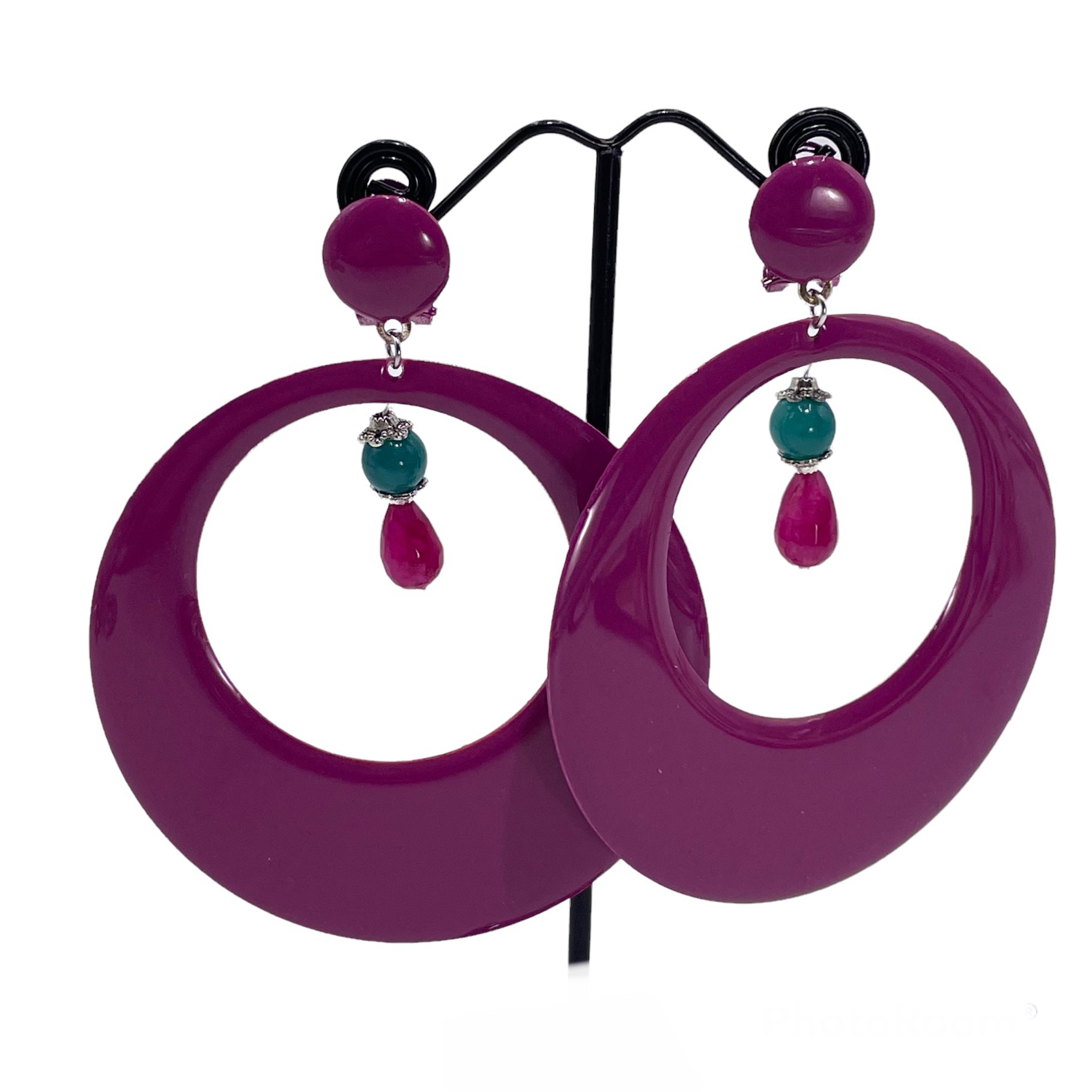 Pendiente de flamenca de aro bugambilla con bola verde y lágrima bugambilla.