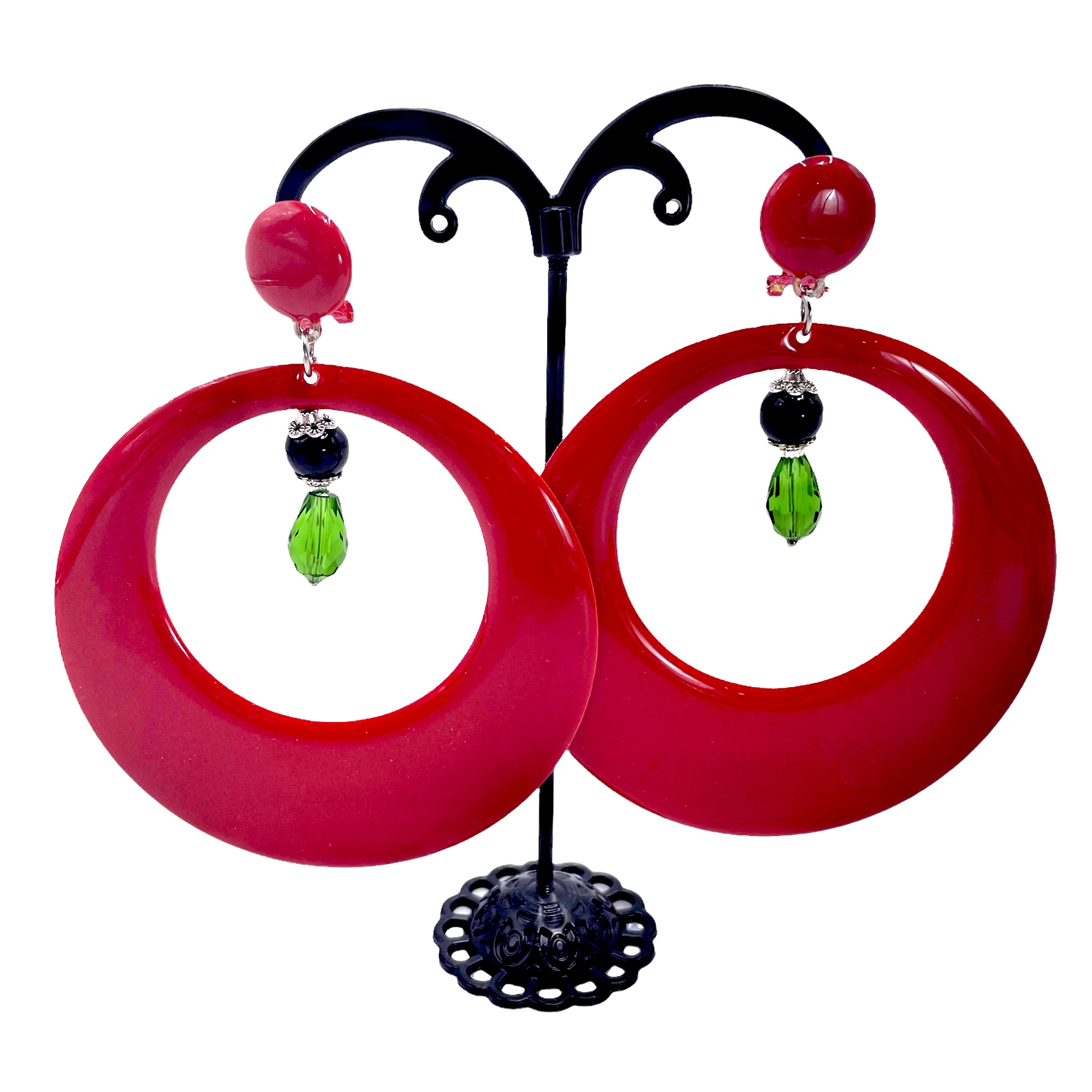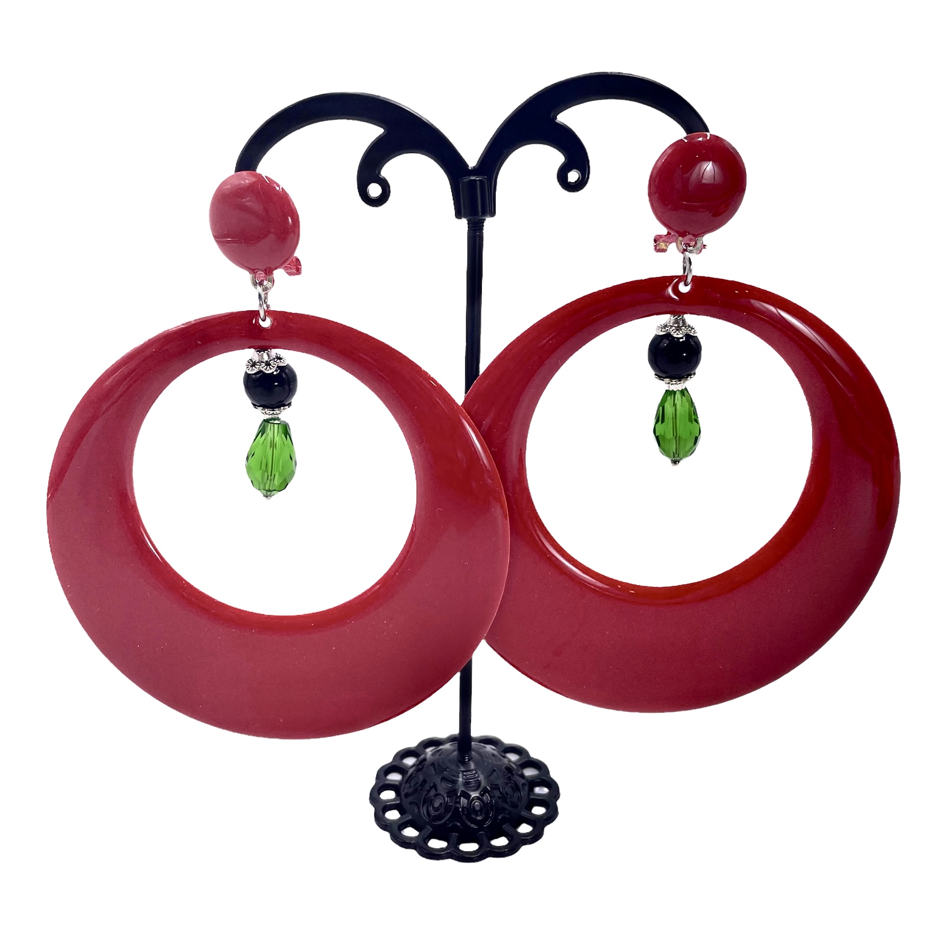 Pendiente de flamenca de aro rojo con bola negra y lágrima verde.